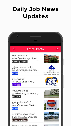 คุณสามารถอ่านการแจ้งเตือนงานจากแผนกรัฐบาลที่แตกต่างกันเช่น KPSC, Sidco, Milma, KSFE, รถไฟ, ธนาคาร, upsc, ssc, psu , กองทัพเรืออินเดียกองทัพเรือ, มหาวิทยาลัยเกรละ, มหาวิทยาลัย Kannur, มหาวิทยาลัย Calicut, ตำรวจ, RRB, โรงพยาบาล, กองทัพอากาศ, 108 รถพยาบาล, บริการพลเรือน (IAS), IBPS, PO ธนาคารและพนักงานและอีกมากมาย