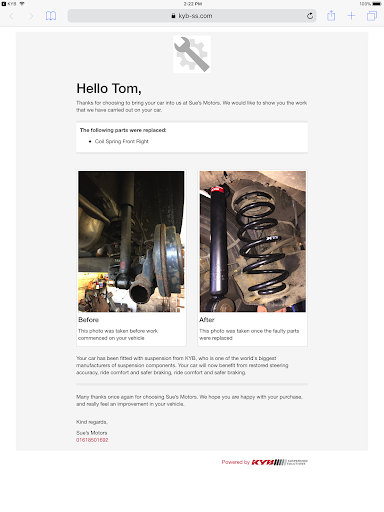 - They then tick the parts that they are replacing, and then attach a photo (via the camera, or camera roll) of what the suspension component looked like before.