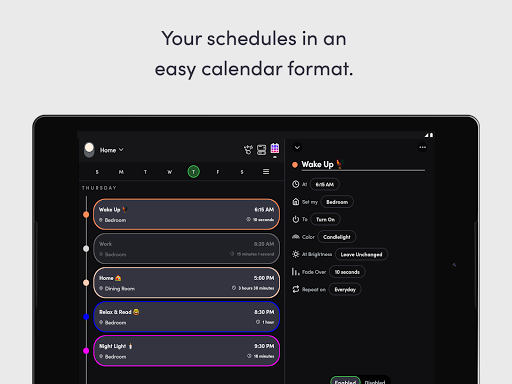 - ตารางเวลา: ทำให้ไฟของคุณจางลงเปลี่ยนสีและเปิด / ปิดโดยอัตโนมัติทั้งหมดนี้สามารถมองเห็นได้ในมุมมองแบบปฏิทินที่ใช้งานง่าย