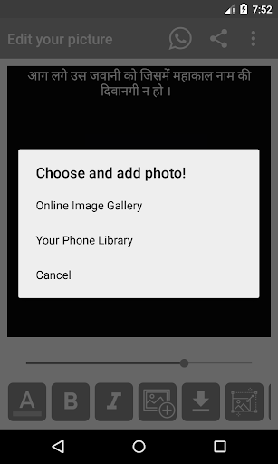 *Mahakal Photo Editing: In this feature, you can choose status and Image of mahakal and edit this. You can modify text, change text color, zoom in or out text, give a different style to the text, you can change the background, resize the image. You can choose mahakal image from our online mahakal gallery or from your phone's image gallary.