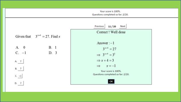 The apps has four parts: 1. Facts that matter with many examples fully solved. 2. 40 multiple choice questions with fully solved solutions. 3. 40 Exam style questions and solutions. 4. Three video clips explaining how to manipulate surds.