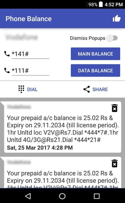 If you use 'Dial' button form our app to make your normal calls, the popup messages after call which have information about call cost and balance will be captured and stored by app. These messages then can be viewed any time for balance or call cost. App can also close(dismiss) these popups automatically for users who find them annoying.