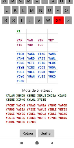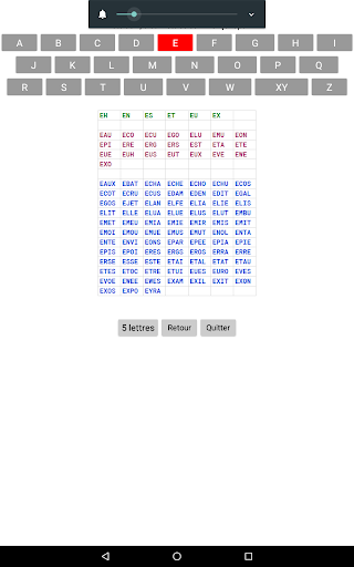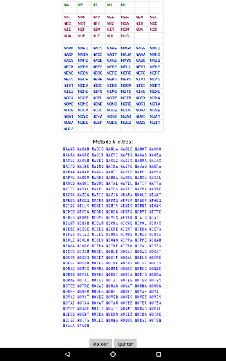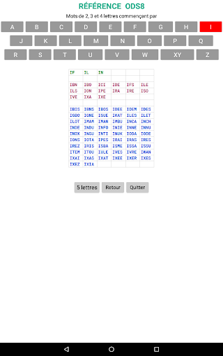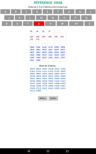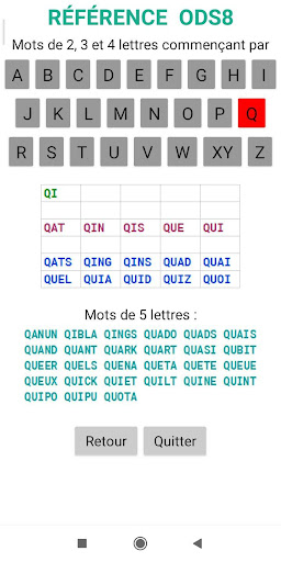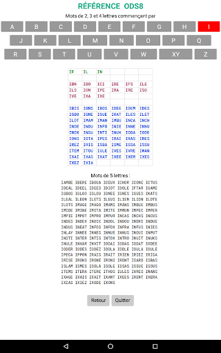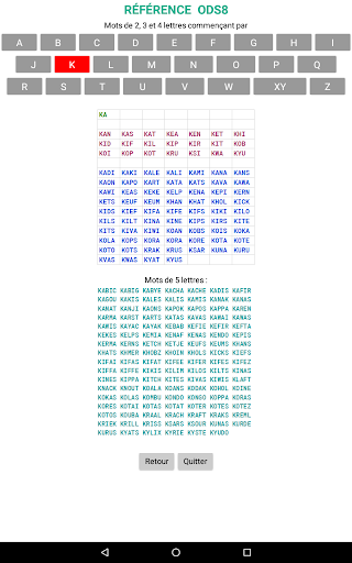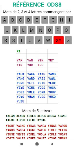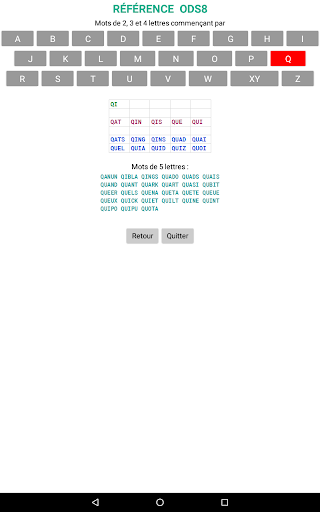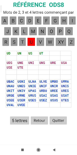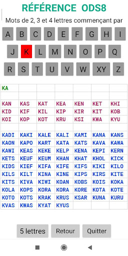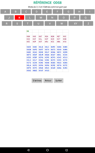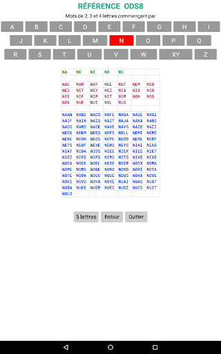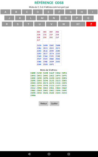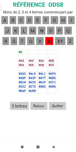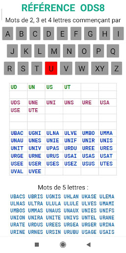 แอปพลิเคชันช่วยให้คุณสามารถแสดงคำทั้งหมดของ 2 ถึง 5 ตัวอักษรที่อ้างอิงโดยพจนานุกรมอย่างเป็นทางการของฝรั่งเศสล่าสุดของ Scrabble