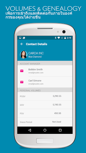ตรวจสอบความเคลื่อนไหวธุรกิจของท่านได้ที่ Volumes & Genealogy ติดตามความเคลื่อนไหวขององค์กร, ผู้บริหารสาขา, สรุปยอดคอมมิสชั่นล่าสุด, รายงานการสั่งซื้อและคะแนน และหากท่านจำเป็นต้องการติดต่อกับดาวน์ไลน์ ท่านสามารถทำได้โดยง่ายดาย My Nu Skin App ยังรวมระบบ Volume & Genealogy เพื่อการบริการและจัดการธุรกิจของคุณทุกที่ทุกเวลา