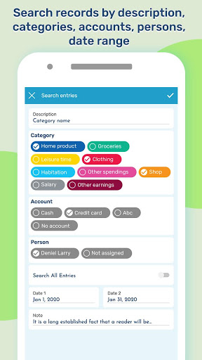 ค้นหารายการใด ๆ ของคุณตามคำอธิบาย, หมวดหมู่, บัญชี, บุคคล, ช่วงวันที่และโน้ต, •ข้อมูลสำรองและกู้คืนข้อมูล (โทรศัพท์, การสำรองข้อมูลไดรฟ์)