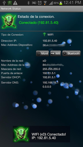 Network Status is an application that reports the status of the network connection or MOBIL WIFI, Display the details of the connection established. Lets share the connection information. Buttons enables quick access to system settings.