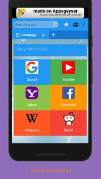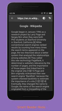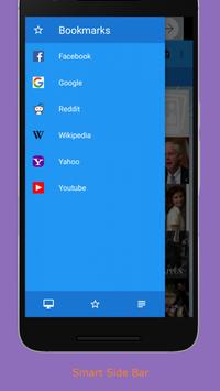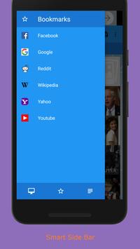 Smart Side Bar Contains already bookmarked web pages of the most searched websites including Google.It also contains a direct shortcut to reader mode.