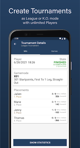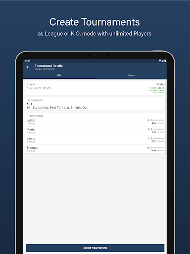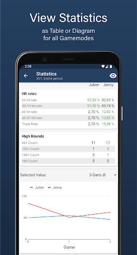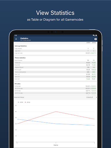 ดูสถิติที่กว้างขวางเกี่ยวกับเกม Dart ของคุณ มีสถิติมากมายสำหรับทุกโหมดเกมซึ่งคุณสามารถดูได้ทั้งสองตารางและเป็นกราฟ เพื่อไม่ให้สูญเสียภาพรวมคุณสามารถเลือกสถิติที่คุณต้องการดูและไม่ได้