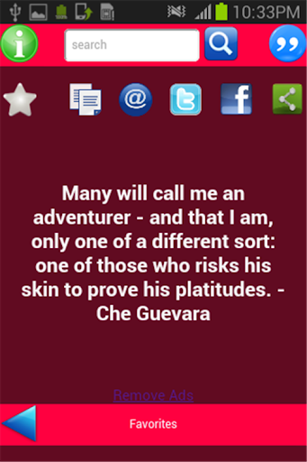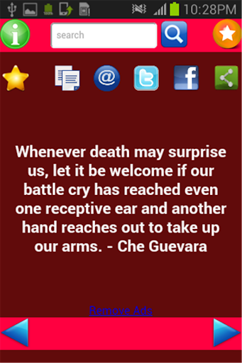 ☆☆☆ไม่มี 1 Che Guevara Quotes App ☆☆☆☆ราคาของ Che เป็นแอปอ้างพร้อมคอลเลกชันของคำพูดยอดนิยมของ Cheuevara และสามารถอ่านค้นหาคั่นหน้าหรือแบ่งปันใบเสนอราคาสุดยอดของ Che Quevara ฟรีErnesto "Che" Guevara (14 มิถุนายน 1928 - 9 ตุลาคม 1967) ซึ่งเป็นที่รู้จักกันทั่วไปในชื่อ Che Guevara, El Che หรือเพียงแค่ Che