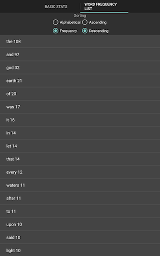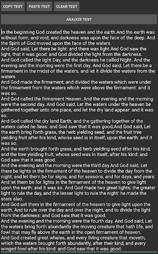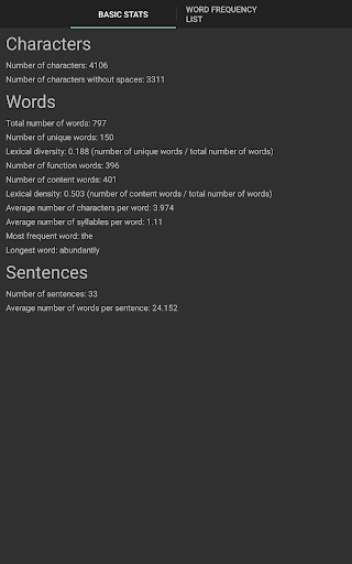 การอ่านตัววิเคราะห์ข้อความนกฮูกคำนวณต่อไปนี้จากข้อความ: จำนวนอักขระ, นับจำนวนคำ, จำนวนคำที่ไม่ซ้ำกัน, ความหนาแน่นของคำศัพท์, ความหลากหลายของคำศัพท์, จำนวนอักขระเฉลี่ยต่อคำ, จำนวนเฉลี่ยของพยางค์จำนวนมากและจำนวนคำเฉลี่ยต่อประโยค