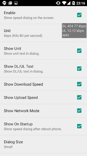- Customization of things to show in small dialog such as size of text, text color, background color, displaying ul/dl speed, etc...