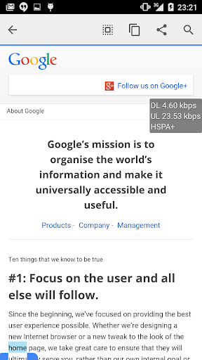 "Real Time Internet Speed Meter" displays/shows internet speed or instance throughput in small dialog on your phone screen. You can see real time download speed and upload speed dialog while using other applications such as browsing a webpage, downloading files, uploading files,