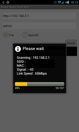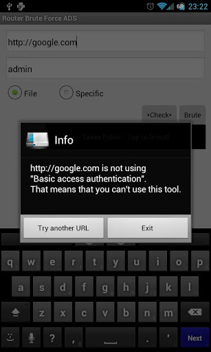 New fixed version finally releasedPlease don39;t use the old version anymore,uninstall it and use only this version.Simple and effective brute force for routers admincontrol pagesBasic Access Authentication gt; Base64You have connection to free WiFi?But if you want to gain access for router settings,for opening some port or something else you need a password.Here Router Brute ForceRBF come to helpIt ships with sample txt file that includes 398 default passwords for different routers,but don39;t forget you can update it with your dataIf you want to enter specific passwords you can use the comma separated future...Be sure to check the login because it39;s casesensitive in some routersadminAdmin.Use this tool only if you have a strong wifi signal and don39;t use dictionary files that are greater than 5MB,otherwise it will work very slowRBF automatically get the default gateway and build the Url,so you don39;t need to do any preparationsonly if you already connected to wifi.This is experimental tool,use it on your own riskPlease rate the tool and leave commentsIf you have troubles with it feel free to email me. Please read the description carefully and don39;t leave negative feedbacks because of low wifi signal or big dictionary files IT IS EXPERIMENTAL app CURRENTLY WORKS NOT ON ALL ROUTERS SO IF YOU WANT TO HELP,PLEASE LEAVE FEEDBACKS WITH YOUR ROUTER MODEL AND MANUFACTURER