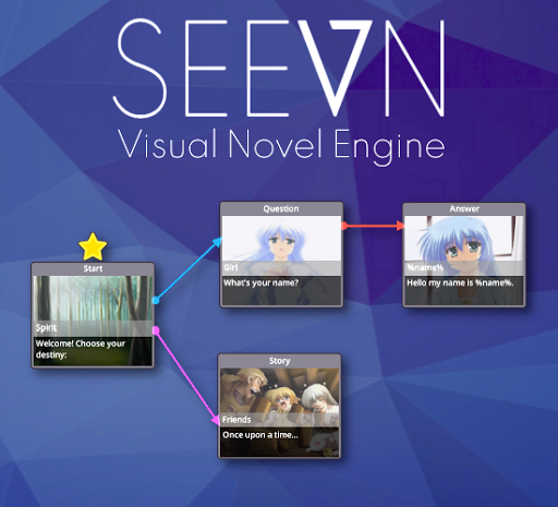 SeeVN เป็นเครื่องมือนวนิยาย Visual (VNE) ที่ช่วยให้ศิลปินและนักเขียนนำเรื่องราวแบบไดนามิกเข้ากับหลายเส้นทางสู่ชีวิตโดยใช้โปรแกรมแก้ไขโหนดที่เข้าใจง่าย ให้ผู้อ่านและผู้เล่นทำการเลือกของตัวเองป้อนข้อมูลและมาถึงตอนจบที่แตกต่างกัน VNS สามารถล็อคจากการตัดต่อเพื่อปกป้องงานของคุณด้วยวิธีการเข้ารหัสที่แข็งแกร่ง ทรัพย์สินสามารถโหลดได้จากที่เก็บข้อมูลในเครื่องหรือเว็บ เรื่องราวที่ใช้ร่วมกันจะเล่นในแอพเดียวกัน