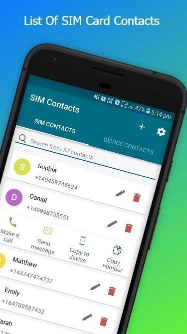 App contains list of SIM contacts and allows you to perform actions like Call, SMS, Edit, Delete, Copy to Device.
