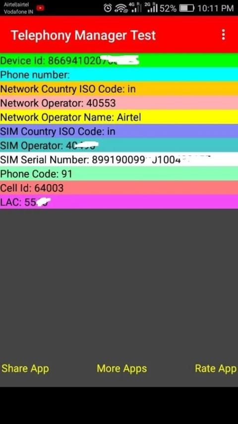 Device ID / Network Country ISO Code / Network Operator / Network Operator Name / SIM Country ISO Code / SIM Operator / SIM Serial Number / Phone Code / Cell ID / LAC