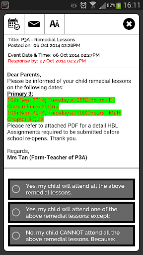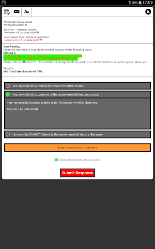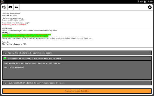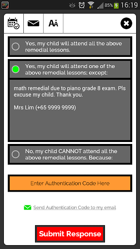 หลักสูตรการเข้าร่วมหลักสูตรซิงค์กับ MOE SC และการแจ้งเตือนผู้ปกครอง / ผู้ปกครอง . รองรับการเข้าร่วมที่ไม่ใช่หลักสูตรเช่น CCA และอื่น ๆ (* พร้อมใช้งานสำหรับผู้ดูแลระบบของโรงเรียนเท่านั้น)