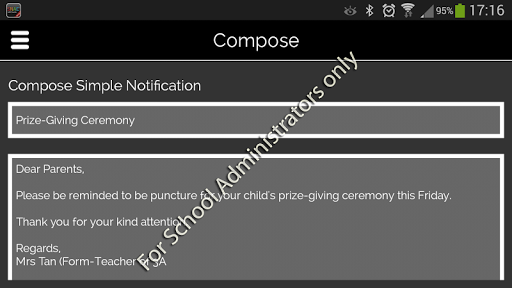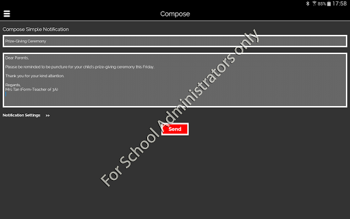 ผู้ดูแลระบบโรงเรียนสามารถเขียนและส่งการแจ้งเตือนแบบเรียลไทม์ผ่านแอปพลิเคชันสมาร์ทโฟน SNAC ™ (* สามารถใช้ได้กับผู้ดูแลระบบของโรงเรียนเท่านั้น)