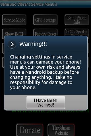 This app will allow you to access the service menu39;s on the Samsung Vibrant with one click. It works the best on Stock JI6 2.1 and Stock JK2 2.2Be careful what you do with this program I assume no responsibility for anything you do in or with this program including damage to your phone