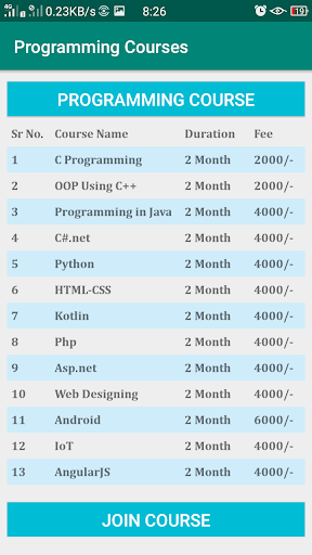 เราเรียกใช้หลักสูตรเช่น MS-CIT, TALLY, DTP, เครือข่ายฮาร์ดแวร์และหลักสูตรขั้นสูงเช่น C, C , Java, .NET, PHP, Python, Android, Angularjs WordPress, IOT และอื่น ๆ
