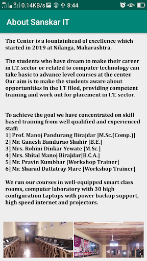 Sanskar IT Solutions เป็นศูนย์ฝึกอบรมและพัฒนาซอฟต์แวร์ ศูนย์กลางเป็นจุดศูนย์กลางของความเป็นเลิศที่เริ่มในปี 2019 ที่ Nilanga, Maharashtra, อินเดีย นักเรียนที่มีความฝันที่จะทำอาชีพของพวกเขาใน I. ภาคหรือที่เกี่ยวข้องกับเทคโนโลยีคอมพิวเตอร์สามารถใช้หลักสูตรระดับความก้าวหน้าขั้นสูงที่ศูนย์ เป้าหมายของเราคือการทำให้นักเรียนตระหนักถึงโอกาสในการยื่นแบบ I.T ให้การฝึกอบรมที่มีความสามารถและออกกำลังกายสำหรับการจัดวางใน I.T. Sector บรรลุเป้าหมายที่เราได้มุ่งเน้นการฝึกอบรมตามทักษะจากพนักงานที่มีคุณสมบัติเหมาะสมและมีประสบการณ์