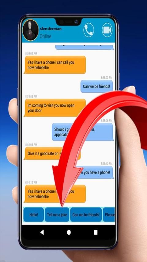 "scary video call , chat with slenderman simulator" is a simulation game in which you receive fake incoming calls and fake incoming video calls from slender the killer, it also simulate having fake chat with him, it's an easy app to use in order to entertain yourself and prank your friends and family and see their frightening and hilarious reactions, This is not a real calling and only a joke! The app does not bear any harm and is only for entertainment!