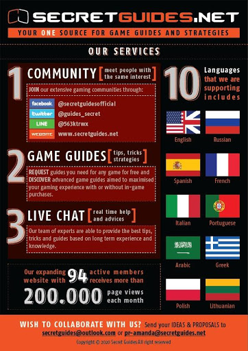 Also, we are fully aware that many players are not speaking English, so “Secret Guides” creates guides in 10 languages the same as gives assistance in the native language. Our strategies are for advanced players.