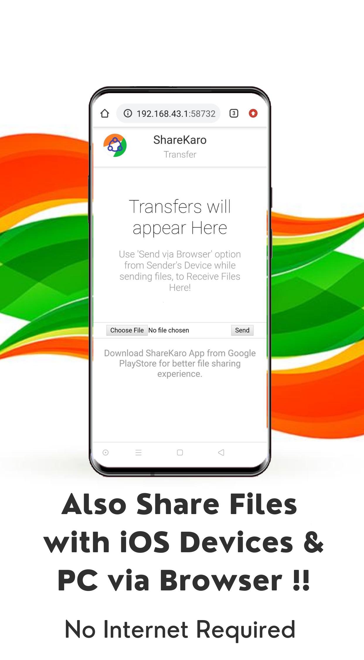 8. Share, Transfer Files via Browser : You can also share your files with Non - ShareKaro Devices like iOS phones, PC using "Share via Browser" option without using a single bit of Internet.