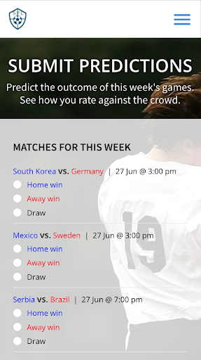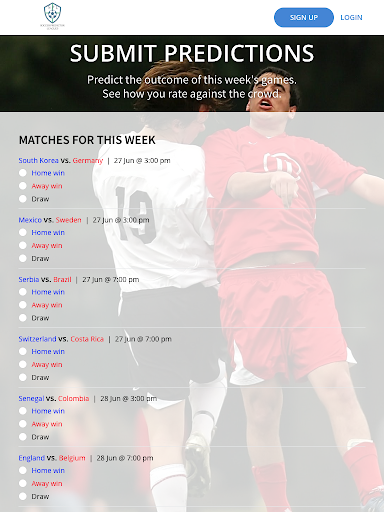 ทุกสัปดาห์เราเลือกการแข่งขันที่กำลังจะมาถึงเจ็ดนัดจากลีกฟุตบอล (ฟุตบอล) ที่สำคัญเช่นพรีเมียร์ลีกอังกฤษ (EPL); The Chinese Super League (CSL); อเมริกันเมเจอร์ลีกซอกเกอร์ (MLS); และลีกฟุตบอลยุโรปที่สำคัญเช่น Serie A ในอิตาลีและ La Liga ในสเปน ผู้เล่น Soccer Predictor Leagues (SPL) คาดการณ์ผลลัพธ์ ("Home Win"; "Win Win" หรือ "Draw") ของการแข่งขันแต่ละครั้ง
