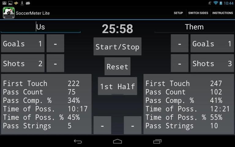 SoccerMeter Lite lets you track the passing and ball possession performance of your favorite soccer team at any level. Simply register player First Touch on the ball using your left thumb for one team and your right thumb for the other team. You do not have to take your eyes off of the action on the field to generate complete team possession and passing statistics just like you see on television for top professional soccer games.
