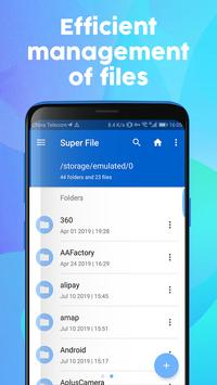 Super File is a complete file manager that allows you to handle any file (image, music, movie, document, app) manager locally and network using a clean, intuitive, material-based design guide interface on your Android device. File Manager allows you to work with any file or folder, regardless of whether they are stored on your device, micro-SD card.