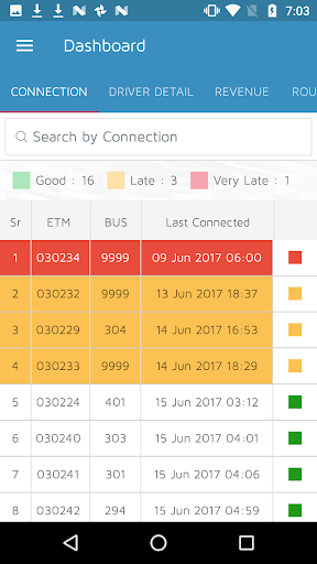 แอปอนุญาตให้ผู้ใช้เห็นรถบัส / โค้ชสดและดูการติดตามแบบออฟไลน์ฟังก์ชันการส่งข้อความไดรเวอร์ช่วยให้ผู้จัดการสามารถรับข้อความจากไดรเวอร์และส่งข้อความไปยังไดรเวอร์ได้ทันทีผู้ใช้สามารถดูข้อมูลรายได้สำหรับไดรเวอร์