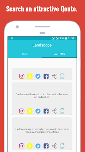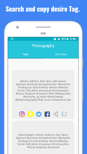 ไม่ว่า Instagram, Snapchat, Twitter Facebook หรือแอพอื่น ๆ คุณอาจปรับปรุงการมองเห็นโพสต์และบทความของคุณบน Instagram, Snapchat, Twitter และ Facebook ด้วยแฮชแท็ก / แท็กที่เลือกเหล่านี้ ด้วย Hashtags ของเราโพสต์ของคุณอาจมองเห็นได้มากขึ้นกับผู้ใช้มากขึ้นและนี่อาจส่งผลให้ได้รับการชื่นชอบผู้ติดตามและความคิดเห็นมากขึ้น นอกจากนี้แอพนี้มีปุ่มลัดเพื่อเปิดเครือข่ายสังคมออนไลน์ที่ได้รับความนิยมมากที่สุดเช่น Instagram, Snapchat, Facebook, Twitter ฯลฯ มีแฮชแท็กและคำบรรยายมากมายสำหรับโพสต์ที่มีหมวดหมู่ของพวกเขา