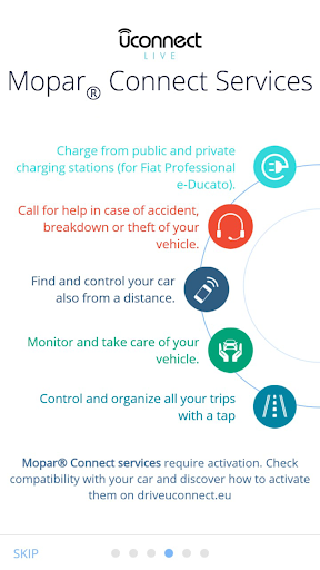 การเปิดใช้งานบริการMopar® Connect นั้นง่ายมาก: กรอกขั้นตอนการเปิดใช้งานครั้งแรกที่ตัวแทนจำหน่ายที่ได้รับอนุญาตจาก FCA รับอีเมลและทำตามลิงค์ลงทะเบียนบัญชีของคุณ หรือเข้าสู่ระบบเมื่อคุณยืนยันข้อมูลยานพาหนะของคุณแล้วคุณจะได้รับอีเมลเมื่อMopar® Connect Services เปิดใช้งานและมีทั้งในแอป UConnect Live และเว็บไซต์ Driveuconnect.eu