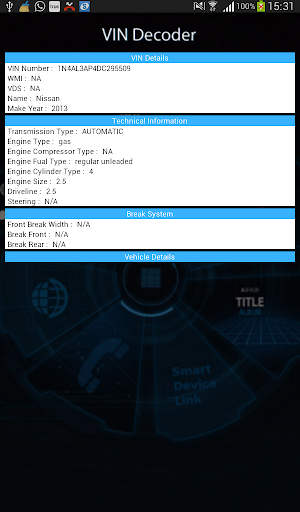 The VIN decoder app for Android will fetch & segregate all the Car information in sections like VIN Info, Engine Information, Price Information, Brake System & Style Info.