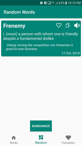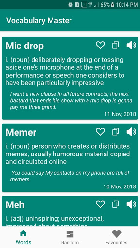ต้นแบบคำศัพท์เพิ่มคำใหม่ทุกวันเพื่อให้คุณเรียนรู้ มันมีส่วนต่อประสานที่ใช้งานง่ายมาก คุณสามารถได้ยินคำศัพท์ของคำเช่นกัน คุณสามารถคัดลอกไปยังคลิปบอร์ดและแบ่งปันกับของคุณเพื่อนบนแพลตฟอร์มที่แตกต่างกัน