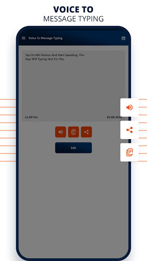 Voice to Message Typing - Speech to Text app provide user to get their Audio in the form of Voice to Message Typing - Speech to Text. Now, with Voice to Message Typing - Speech to Textyou can convert voice note to text accurately because it is a Voice typing in all languages ! It converts audio of all languages. Easily translate audio to text within no time with all new voice to Text converter . Voice to Message Typing - Speech to Text online voice recognition in all languages.