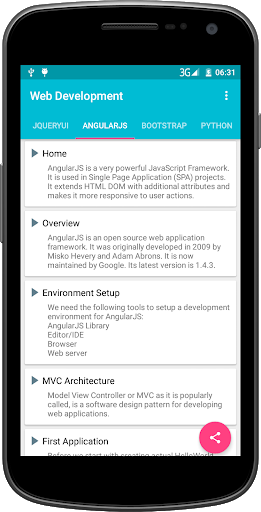 Web Development is a Free app which teach you how to design and develop a web site and web application using PHP, MYSQL, CSS, CSS3, HTML, HTML5, JAVASCRIPT, jQeury, jQueryUI, AngularJS, Bootstrap, Ajax, Python, JSON,