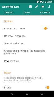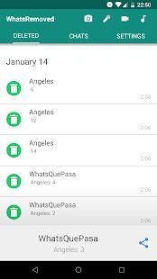 Detect and save deleted messages and WhatsApp files. Install WhatsRemoved, select what content you want to save and you will not miss anything. WhatsRemoved detects when someone deletes a message from WhatsApp, an image or any other file and saves them. With WhatsRemoved we take care to show you what your contacts do not want you to see. Do not let anyone delete a WhatsApp message without you noticing with WhatsRemoved.