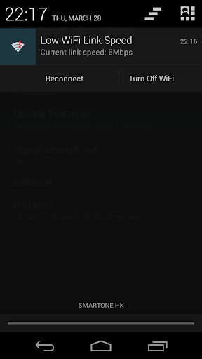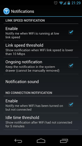 * การแจ้งเตือนที่ผู้ใช้สามารถตั้งค่าได้เมื่อความเร็วลิงก์ WiFi ลดลงไปยังระดับที่แน่นอนหรือ WiFi ได้เปิดอยู่ แต่ไม่พบการเชื่อมต่อ .