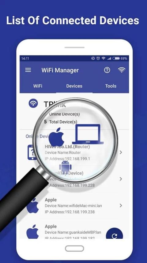 WiFi Manager is a tool to quickly identify other devices who are using your WiFi network and causing your network speed slow.