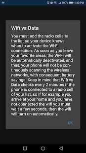 You must add the radio cells to the list so your device knows when to activate the Wi-Fi connection. As soon as you leave your favorite areas, the Wi-Fi will be automatically deactivated, and thus, your phone will not be continuously scanning the wireless networks, with consequent battery savings. Keep in mind that Wifi vs Data checks every 2 minutes if the phone is connected to a radio cell of your list, so if for example you arrive at your house and you have not connected the wifi you must wait a few seconds, then the wifi will turn on automatically.