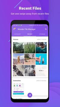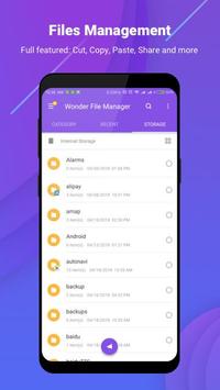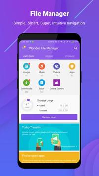 Key Features of Wonder File Manage★ Full-featured File Manager (Explorer)This pro Android file manager and explorer provides full-featured file management, including cut, copy, paste, move, delete, rename, check detail, share files, etc. for internal memory and SD card. It works perfectly as file renamer and viewer as can open any file format.★ Super Fast File TransferWith build-in wifi file transfer, this free file manager and explorer exploits wifi & hotspot to transfer files to another phone and PC even without internet connection. Without limitation for file size and type, users can transfer any file including apps, video, music, picture, etc. super fast.★ Storage Analysis & Junk File CleanIntelligently, this pro file manager will analyze storage usage, detect large files, redundancy files, and newly-created files. Therefore users can make sense of storage usage, clean junk file and other files & folders that are no longer needed effortlessly.★ File SearchThe optimized search engine of file explorer will find file in internal storage and SD card in 1 second. And users can browse files by category, e.g. image, music, video, apps, etc.★ Private & SafeThis free file manager and explorer provides 100% local file management. Therefore there is no risk of any file leak. Your files and information are completely safe.