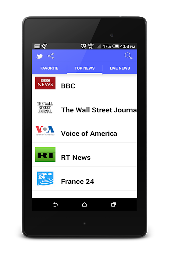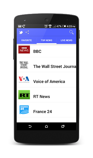 3. Top News Links - We have gathered some of the top news links to be more easily accessible to our users and they are located in this category – BBC NEWS, THE WALL STREET JOURNAL, VOICE OF AMERICA, RT NEWS, NEW YORK TIMES, FRANCE 24, ALJAZEERA, CNN, REUTERS, BLOOMBERG, WASHINGTON POST, THE WORLD POST, UPI, FORBES and NEWS WEEK.