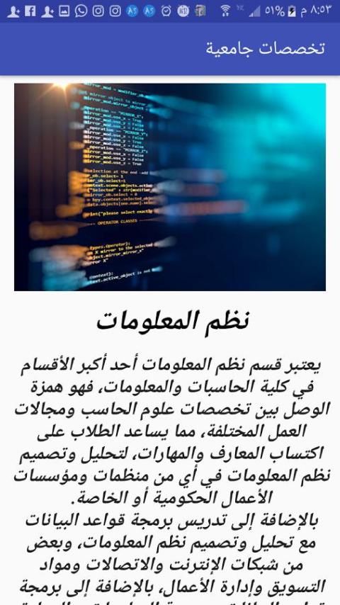 The application of university disciplines is the first of its kind offering you information about the most important undergraduate majors in the world. You can find out information about each specialty in the application and what areas of specialization and also work related to specialization Hama. Just make your life goal, select the specialization that will take you to your goal, we hope to be decreed a path, we explained the BIOS, Hbnak light, bright future.