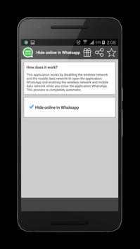 The application basically detects the opening and closing of the WhatsApp to perform certain actions and not be detected by others online. When you open the application WhatsApp the application quickly disables the wireless network and the data network and to close the Whatsapp reactivated connections.