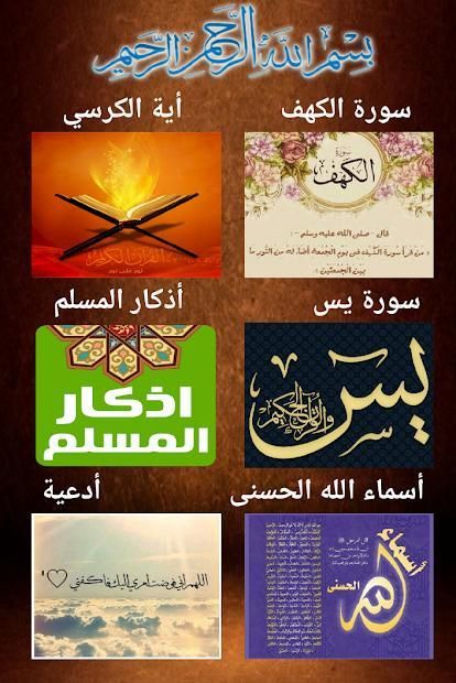 تطبيق آيات و أذكار يتكون من أية الكرسي و سورة الكهف وسورة يس و أدعية و أذكار المسلم و أسماء الله الحسنى ومعانيها