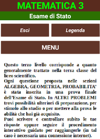 Questo terzo livello corrisponde a quanto generalmente trattato nella terza classe del liceo scientifico. Ogni questione proposta nelle sezioni ALGEBRA, GEOMETRIA, PROBABILITÀ è stata inserita in una prova finale dell’Esame di Stato. In ALTRI PROBLEMI trovi possibilità ulteriori di preparazione, per stimolo allo studio o per mettere alla prova le abilità che hai già acquisito. Puoi scrivere e controllare subito le tue risposte oppure seguire il procedimento interattivo guidato per raggiungerle (in tal caso è necessaria una connessione internet).
