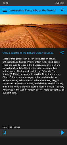 Interesting Facts About the World has hundreds of interesting facts in it and each of them is hand-picked, verified, pictured and reviewed by a team of professional editors. Besides, every fact has a detailed explanation and a source link for you to gain insight and learn more.