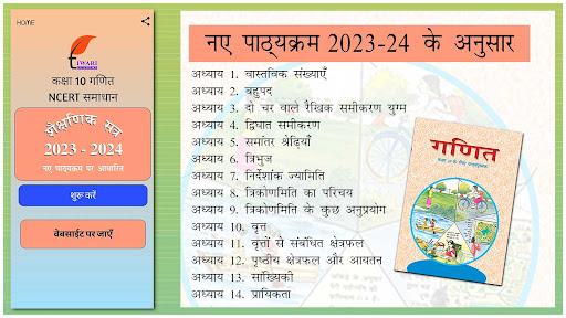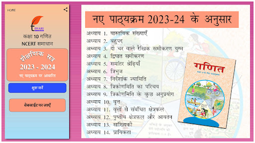 คณิตศาสตร์ระดับ 10 (ganit) ในสื่อภาษาฮินดีมันขึ้นอยู่กับหลักสูตร CBSE ปัจจุบันสำหรับเซสชันใหม่ 2023-24ตามหลักสูตรใหม่และตำรา NCERT ที่หาเหตุผลเข้าข้างตนเองหลักสูตรของคณิตศาสตร์ระดับ 10 จะลดลงตาม NEP 2000 โซลูชั่น NCERT สำหรับคลาสสำหรับคลาส 10 คณิตศาสตร์ในสื่อภาษาฮินดีรวมถึงบทต่อไปนี้: